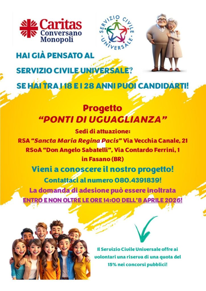 Viene offerta una possibilità per giovani di età 18 – 28 anni. Si tratta dell’esperienza del SERVIZIO CIVILE. Caritas diocesana propone il progetto presso la RSA “Sancta Maria Regina Pacis” e la RSoA “Don Angelo Sabatelli” in Fasano. E’ un’occasione formativa unica, un tempo per conoscersi, conoscere il territorio, vivere il servizio, crescere nelle competenze umane e professionali. Gli aspiranti…