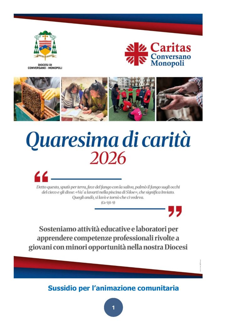 Carissimi, allego il materiale per la colletta della quaresima di carità che il nostro vescovo vuole destinare per sostenere le attività educative e formative (apprendere competenze lavorative) che si stanno realizzando e si realizzeranno nella nostra Diocesi indirizzate a giovani e giovani adulti. In allegato ci sono un sussidio per eventuali attività di animazione che possono essere vissute nelle parrocchie…