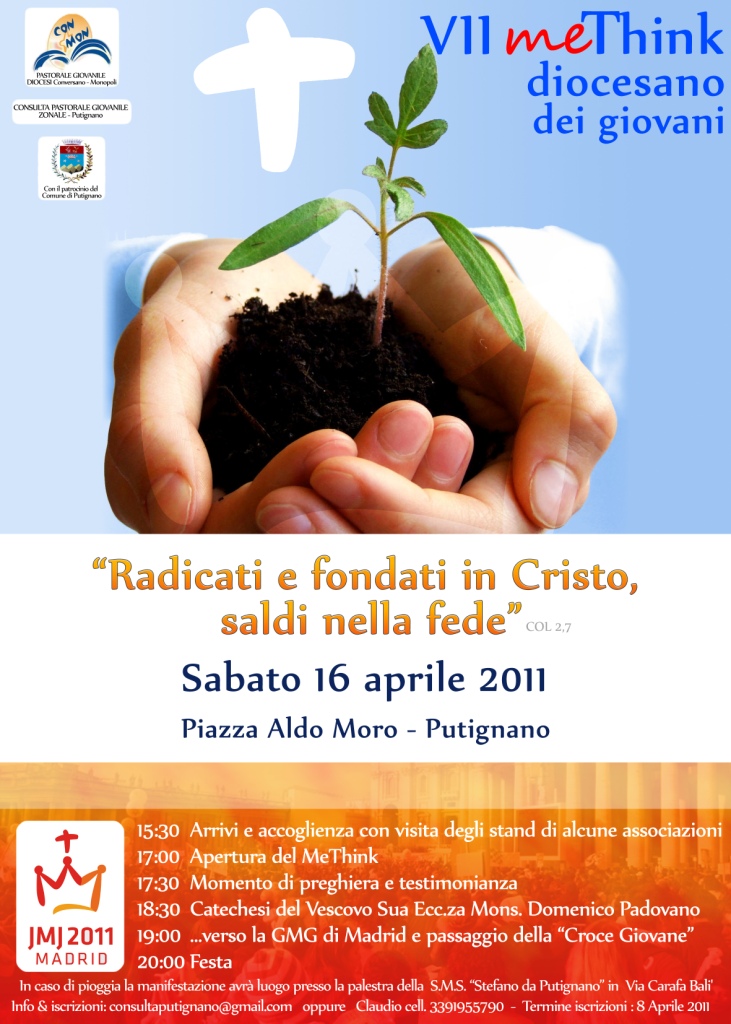 CONSULTA ZONALE DI PASTORALE GIOVANILEPutignano COMUNICATO STAMPA Il prossimo sabato 16 aprile 2011, vigilia della Domenica delle Palme, la zona pastorale di Putignano ospiterà il VII MeThink dei giovani della diocesi di Conversano – Monopoli. Location dell’iniziativa sarà Piazza Aldo Moro, nel cuore della città. Il tema dell’incontro è ‘Radicati e fondati in Cristo, saldi nella fede’ (dalla Lettera di S. Paolo apostolo ai Colossesi 2,7), in sintonia con il Messaggio di Papa Benedetto XVI per la XXVI Giornata Mondiale della Gioventù, che si terrà a Madrid nel prossimo agosto. Il MeThink sarà certamente occasione per preparare i ragazzi e i giovani a vivere questo grande evento, sebbene non tutti vi parteciperanno fisicamente. Ecco il programma: h 15.30 – Arrivi e accoglienza. Visita di stand di alcune associazioni cittadine e diocesaneh 17.00 – Apertura del MeThinkh 17.30 – Momento di preghiera, danza e testimonianzeh 18.30 – Catechesi del Vescovo Mons. Domenico Padovanoh 19.00 – ‘verso la GMG di Madrid e passaggio della Croce Giovaneh 20.00 – Animazione e festah 22.00 – Conclusione Significativa è la presenza e la collaborazione con alcune associazioni cittadine e diocesane (Bottega dell’Orefice, Vivi la Strada.it, Progetto ‘Policoro’ – Caritas diocesana, S.ol.co, Ass. Giovanni XXIII, Ass. Fratres donatori di sangue, Legambiente) che aiuteranno i ragazzi a ripercorrere il Messaggio papale per la GMG.Attesi circa 500 partecipanti, ognuno dei quali riceverà una sacca riciclabile!Info e iscrizioni a: consultaputignano@gmail.com o a Claudio (cell.3391955790). In caso di maltempo la manifestazione si svolgerà nella palestra della Scuola Media Statale ‘Stefano da Putignano’ in via Carafa Balì. Con preghiera di diffusione. I responsabili diocesani Don Vito Castiglione Don Roberto Turco e la Consulta di PutignanoDon Giancarlo Carbonara