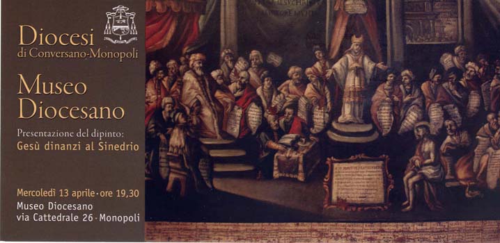 Mercoledì 13 Aprile – ore 19,30 – Museo Diocesano – Via Cattedrale 26 – MonopoliPresentazione del dipinto:Gesù dinanzi al Sinedrio Incontro conMaria De Mola, docente di Storia dell’arteAntonella Saponara, restauratrice IntervieneS.E. Mons. Domenico PadovanoVescovo della Diocesi di Conversano-Monopoli Interventi musicaliManuela Colella – ArpaValerio Latartara – Violino