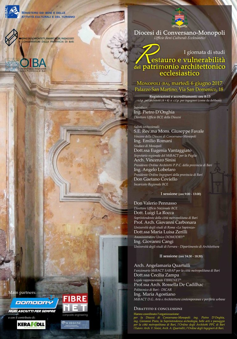 La giornata è organizzata dall’Ufficio per i Beni Culturali Ecclesiastici e l’Edilizia di Culto della Diocesi di Conversano-Monopoli in collaborazione con la Soprintendenza Archeologia Belle Arti e Paesaggio per la Città Metropolitana di Bari, gli Ordini Professionali degli Architetti, Pianificatori Paesaggisti e Conservatori e degli Ingeneri della Provincia di Bari.