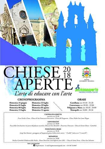 Il tema prescelto dalla diocesi di Conversano – Monopoli – Ufficio Beni Culturali Ecclesiastici è “L’arte di educare con l’arte” e prevede visite guidate serali per scoprire e conoscere le bellezze artistiche del nostro territori a partire dal 24 giugno 2018 fino al 12 agosto 2018.