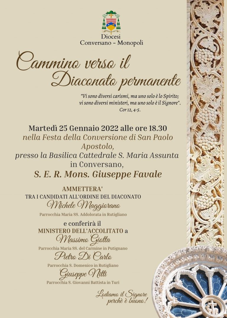 Martedì 25 Gennaio 2022 alle ore 18.30 nella Festa della Conversione di San Paolo Apostolo, presso la Basilica Cattedrale S. Maria Assunta in Conversano,