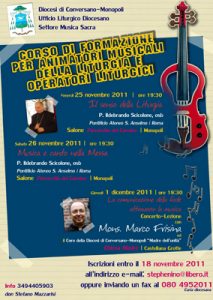 PROGRAMMA Venerdì 25 novembre 2011 – Ore 19.30Salone Parrocchia Carmine di Monopoli”Il senso della Liturgia” – P. Ildebrando Scicolone, osb Sabato 26 novembre 2011 – Ore 19.30Salone Parrocchia Carmine di Monopoli”Musica e canto nella Messa” – P. Ildebrando Scicolone, osb Giovedì 01 dicembre 2011 – Ore 19.30Chiesa Madre di Castellana Grotte”La comunicazione della fede attraverso […]
