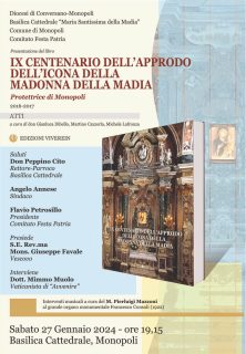 Presentazione del libro: IX Centenario dell’approdo dell’Icona della Madonna della Madia Protettrice di Monopoli ATTI 2016 – 2017 Sabato 27 Gennaio 2024 – Ore 19,15 – Basilica Cattedrale – Monopoli
