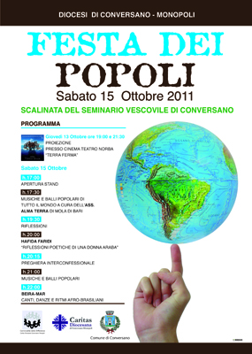Per la prima volta l’uomo ha realmente compreso di essere un abitante del pianeta e forse deve pensare e agire in una nuova prospettiva, non solo nella prospettiva di un individuo, di famiglia o di genere, di Stato e di gruppo di Stati, ma anche nella prospettiva planetaria.’ (Vernadski). La Festa dei popoli, un’occasione propizia:· Per un confronto sulla diversità delle culture e sulla comune identità terrestre a partire dalla visione gratuita del film ‘Terra ferma’.· Per dire NO ai respingimenti e a ogni forma di razzismo e pregiudizio nei confronti degli immigrati· Per dire SI all’integrazione e al dialogo fra popoli e culture· Per condividere un comune cammino spiritualeL’iniziativa è promossa dalla Caritas Diocesana, nell’ambito del Progetto ‘Convivialità delle differenze’. Programma Giovedì 13 Ottobre 2011 – Ore 19.00 e 21.30Proiezione presso CinemaTeatro Norba “Terra Ferma” Sabato 15 OttobreOre 17.00 – Apertura StandOre 17.30 – Musiche e balli popolari di tutto il mondo a cura dell’ ASS. ALMA TERRA di Mola di BariOre 19.30 – RiflessioniOre 20.00 – HAFIDA FARIDI “Riflessioni poetiche di una donna araba”Ore 20.15 – Preghiera InterconfessionaleOre 21.00 – Musiche e balli popolariOre 22.00 – BEIRA-MAR Canti danze e ritmi afro-brasiliani