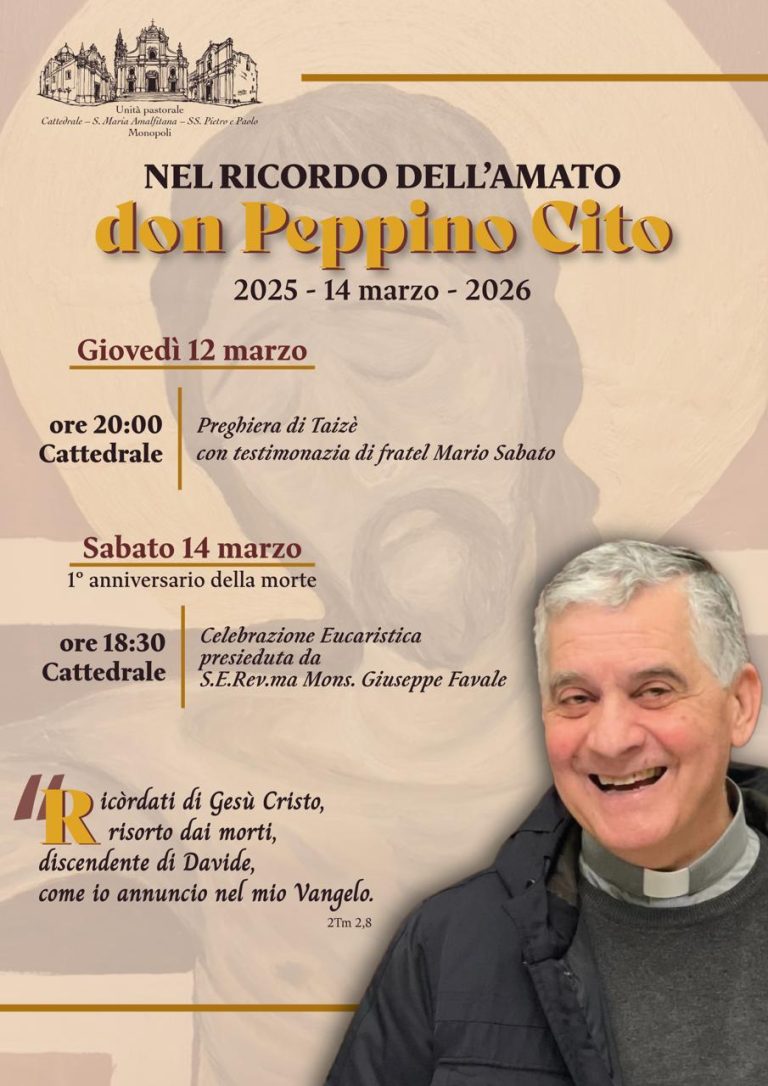 I anniversario della morte di Don Peppino Cito sabato 14 Marzo Descrizione: Sabato 14 marzo 2026 Ore 18,30 – Basilica Cattedrale – Monopoli Inizio: 14/03/2026 18:30 Fine: 14/03/2026 20:00 Categorie: Agenda diocesana, Agenda pastorale Città: Monopoli Regione: Puglia Paese: Italia 3 Marzo 2026